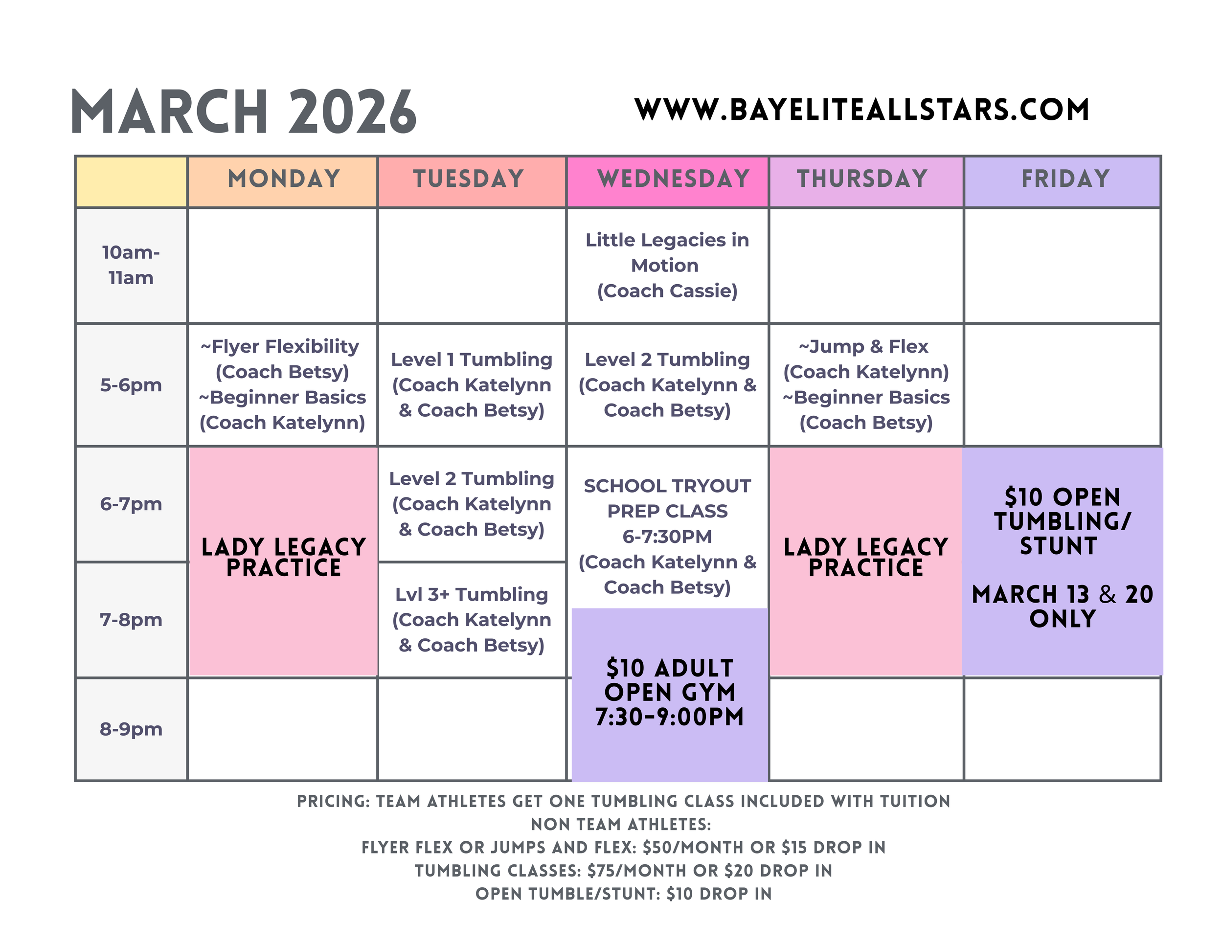 March is stacked at Bay Elite! We’re excited to offer skill-building classes for all levels — plus NEW School Cheer Tryout Prep for middle school and high school athletes.